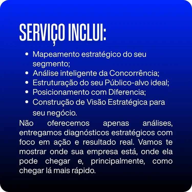 Nosso serviço entrega a visão estratégica que expõe as fraquezas da concorrência e revela as oportunidades de mercado que ninguém está vendo. Com esse conhecimento, suas ações se tornam mais rápidas, mais inteligentes e mais lucrativas, forçando os outros a jogarem o seu jogo. Deixe de ser um seguidor e assuma a liderança. Se torne mais um cliente satisfeito com os nossos serviços